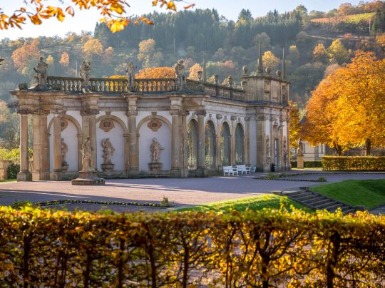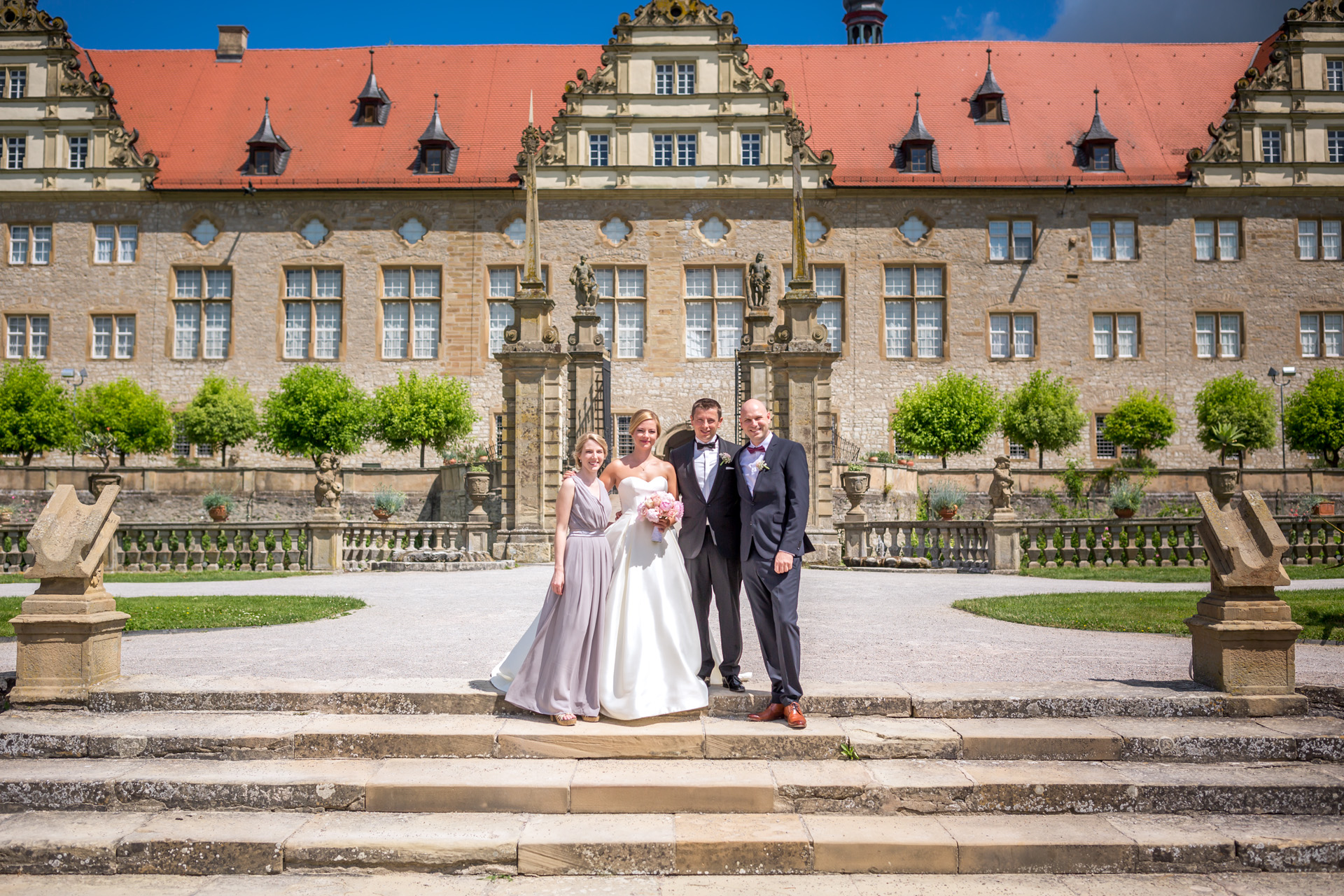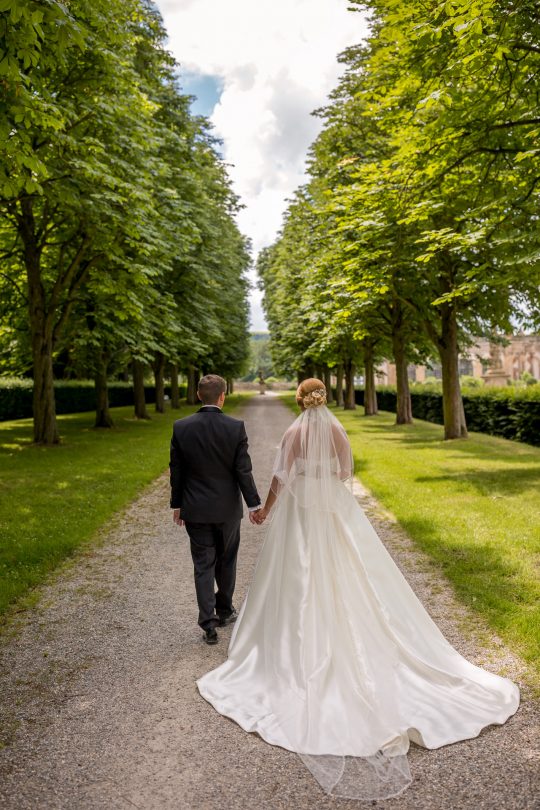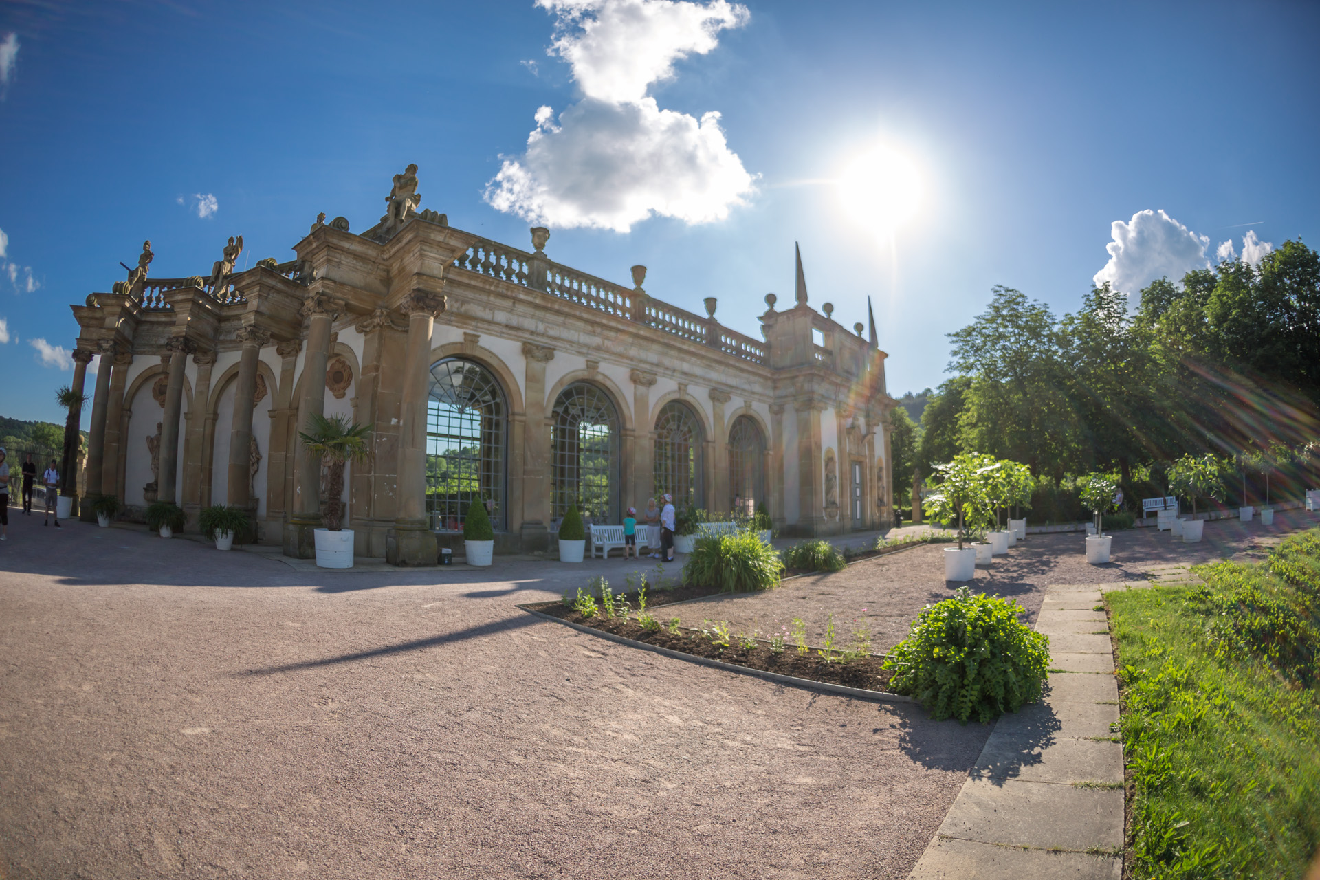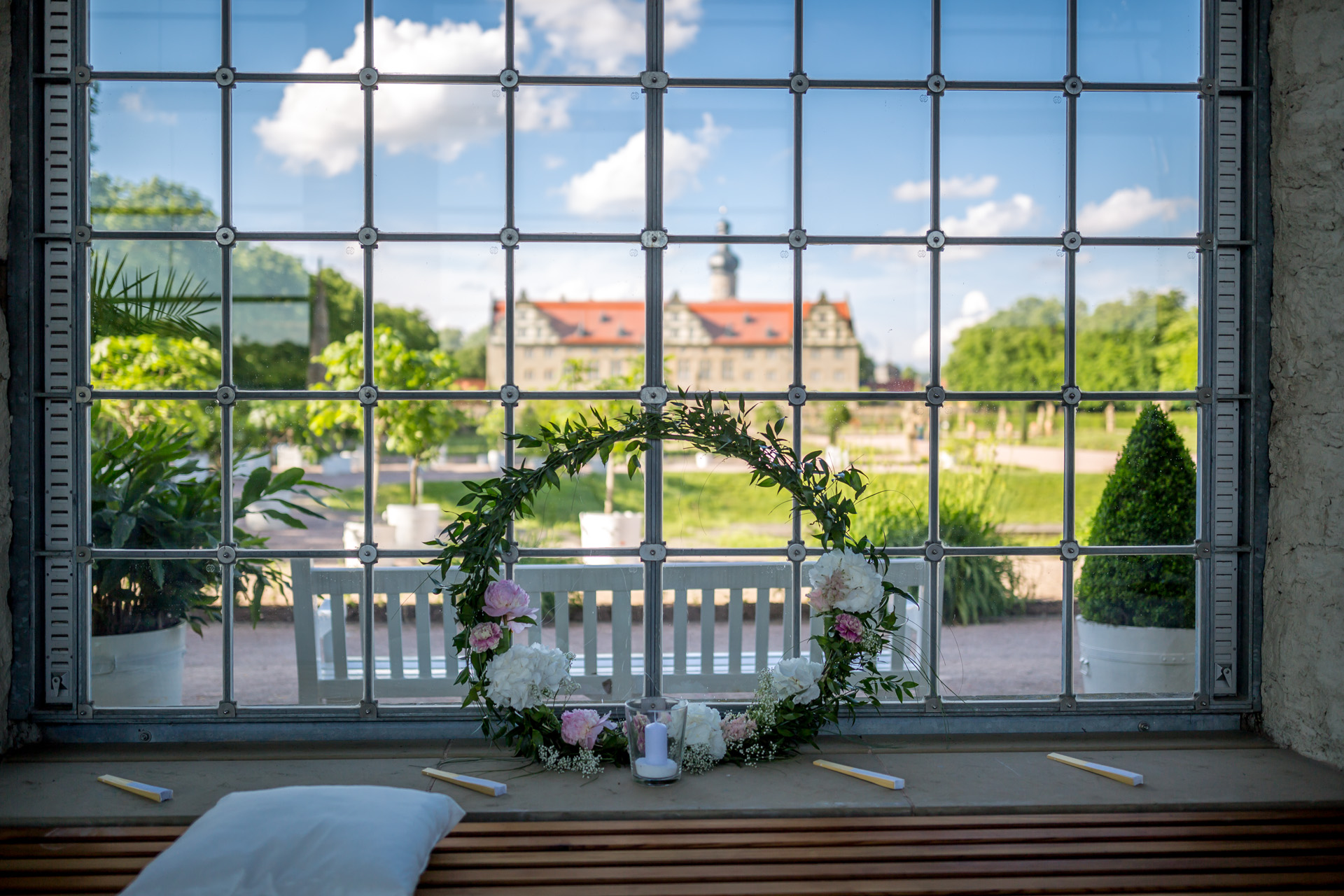 Die Orangerie rahmt wie eine Theaterkulisse den Blick vom Schlossgarten in die grünen Hügel der Hohenloher Landschaft ein. Nach einem kurzen Spaziergang durch den Park, werden wir hier gemütlich leckeren Kuchen essen und die Hochzeitstorte anschneiden.