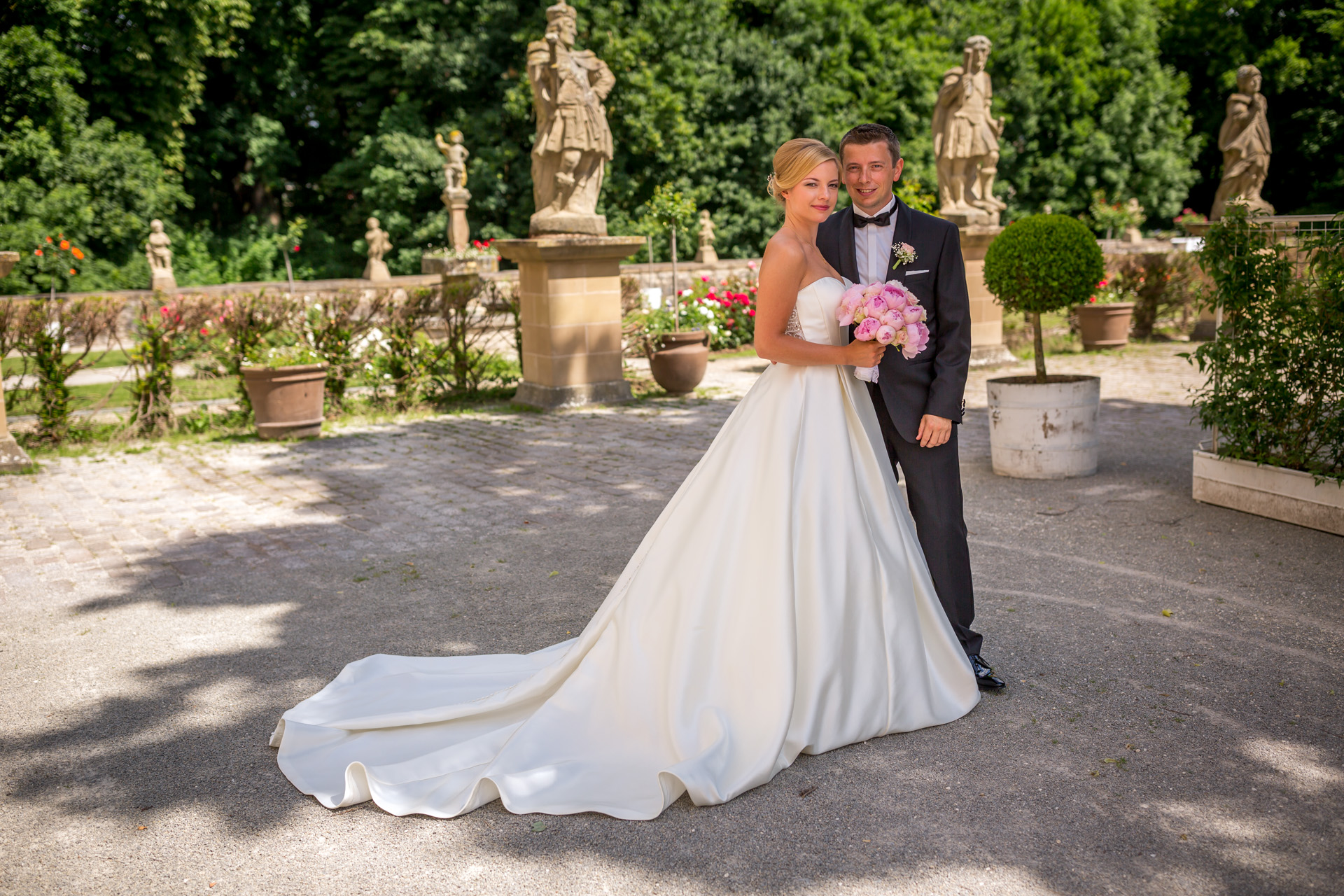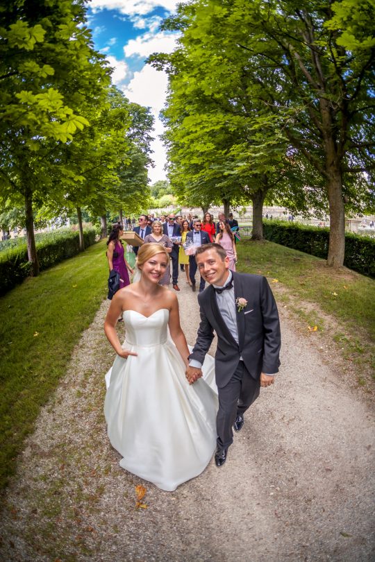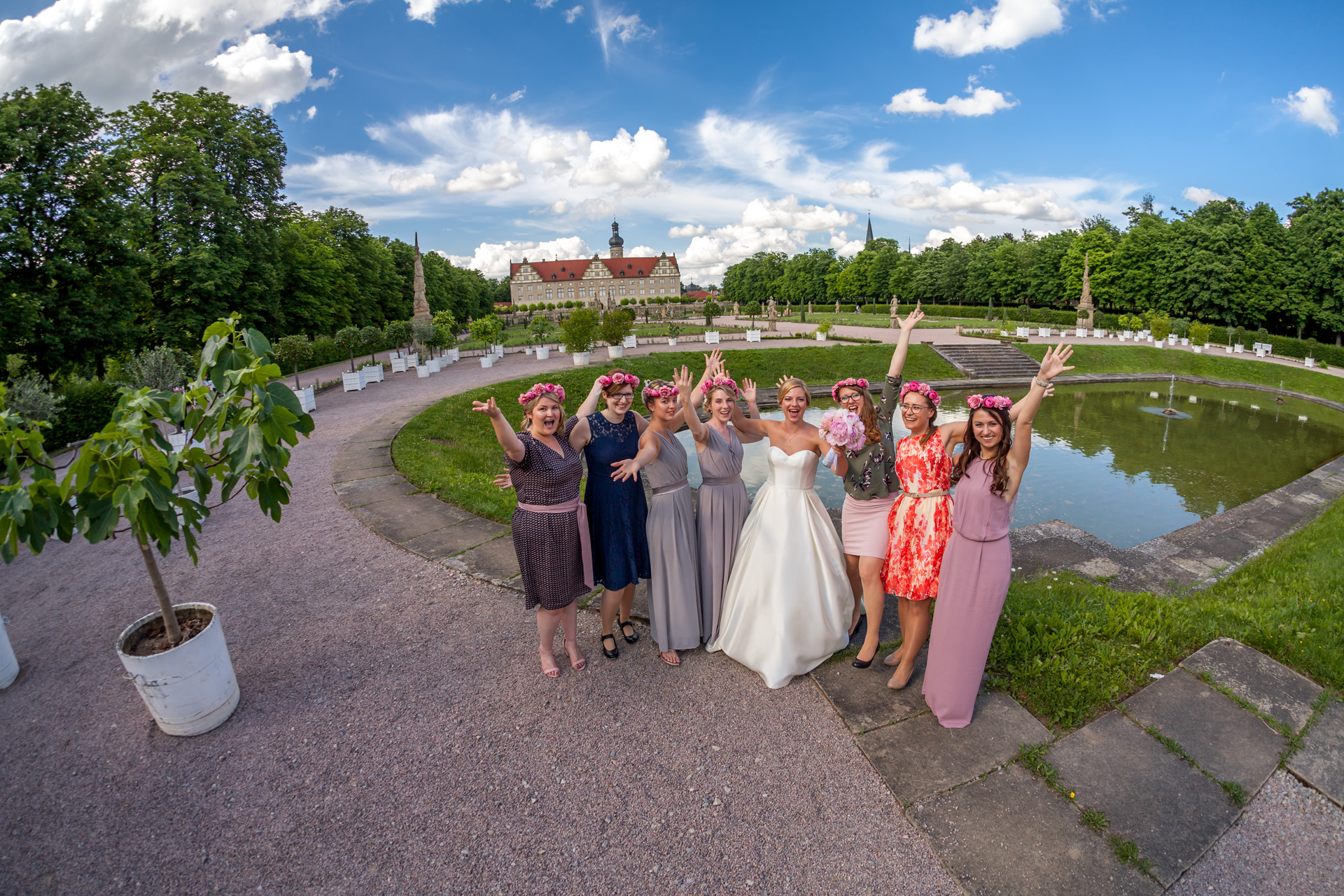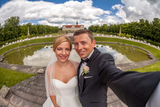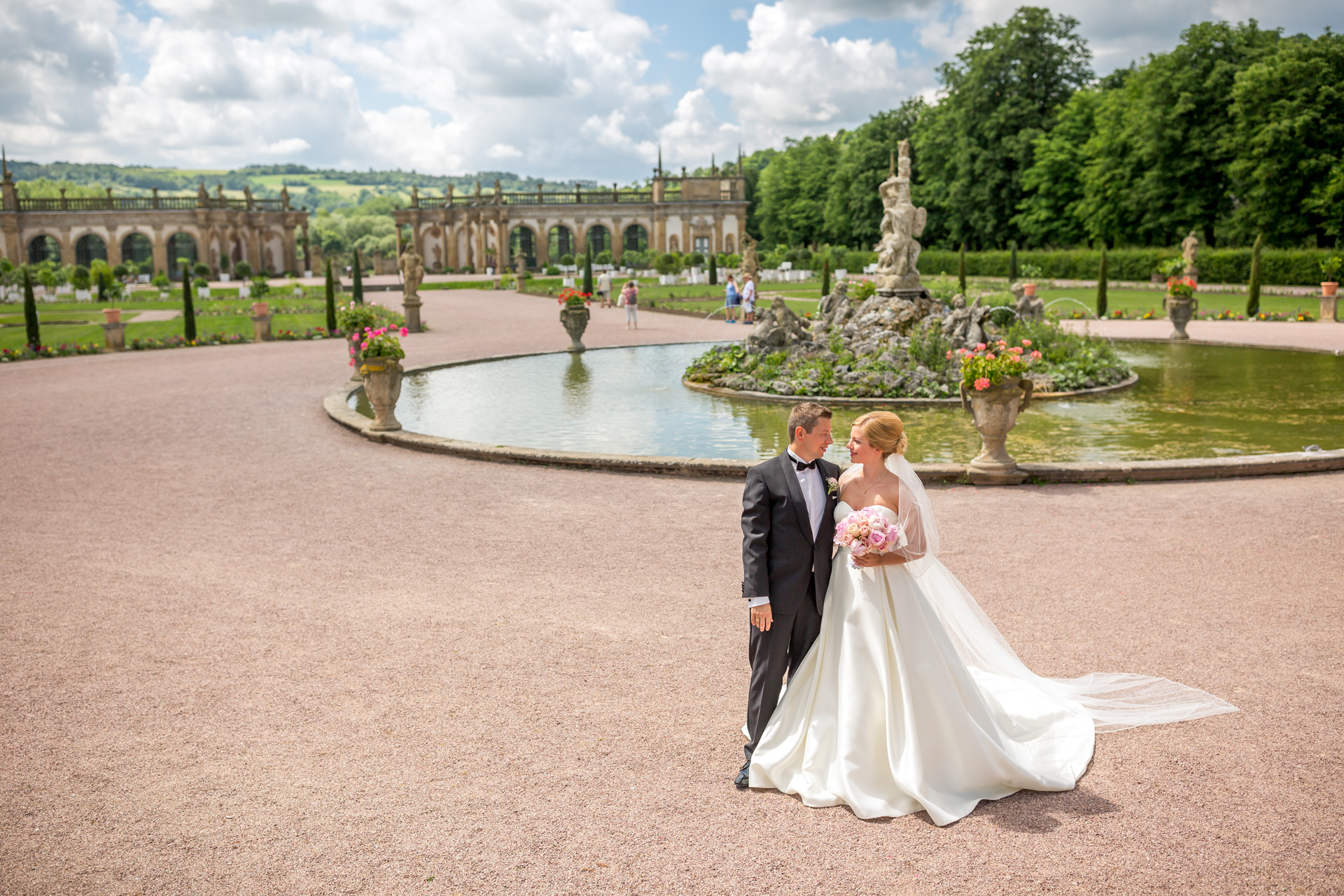 Die Orangerie rahmt wie eine Theaterkulisse den Blick vom Schlossgarten in die grünen Hügel der Hohenloher Landschaft ein. Nach einem kurzen Spaziergang durch den Park, werden wir hier gemütlich leckeren Kuchen essen und die Hochzeitstorte anschneiden.