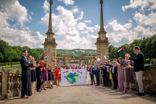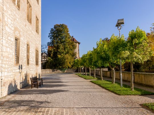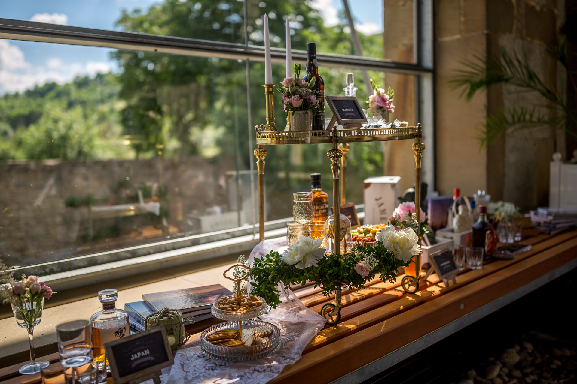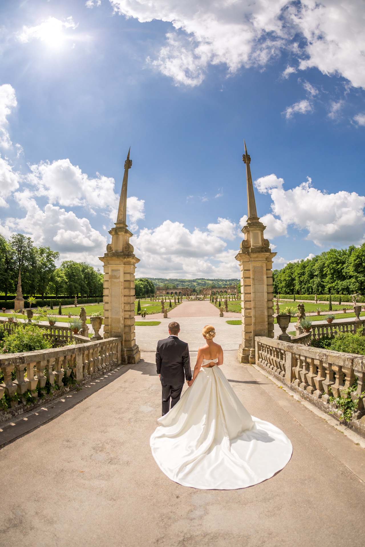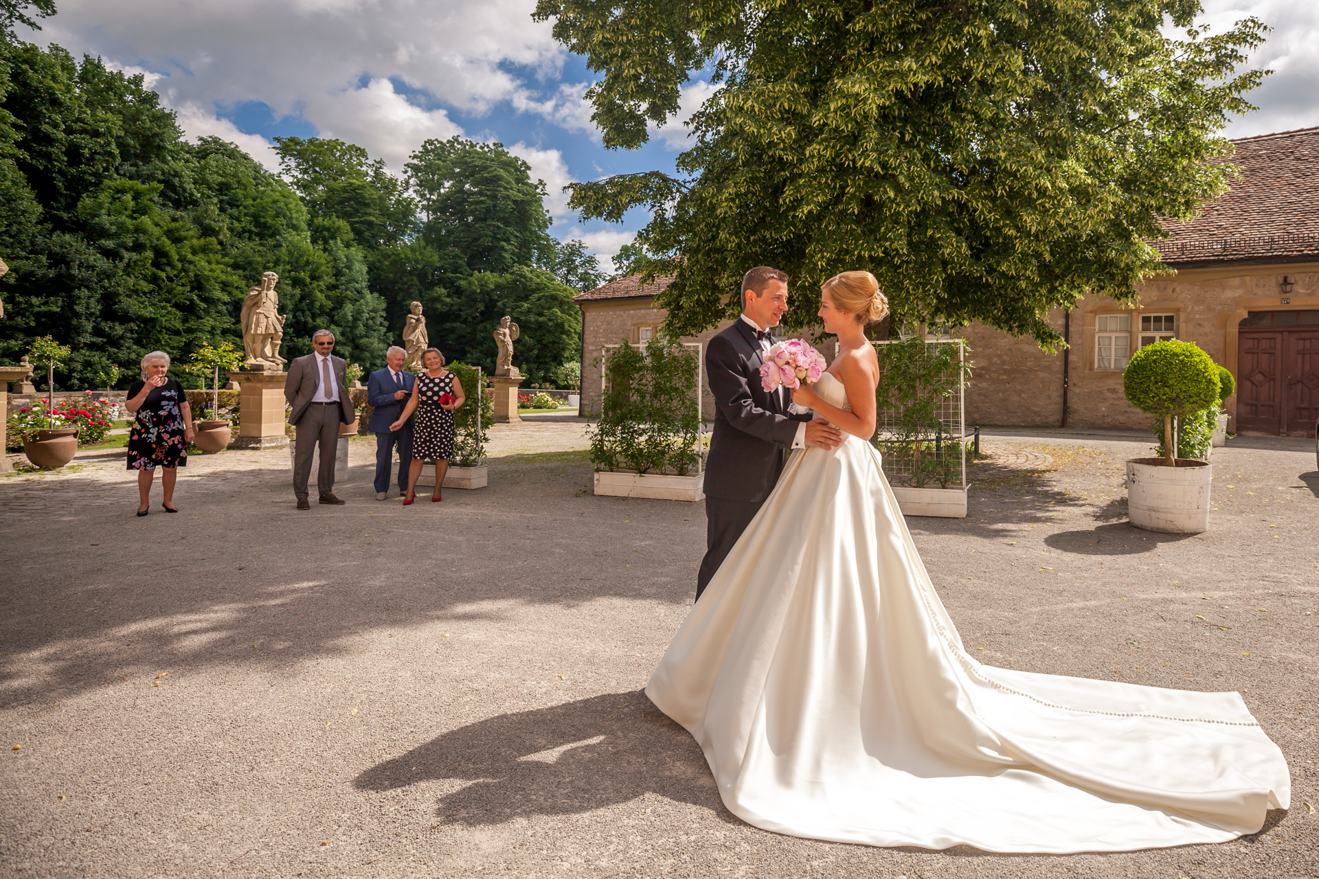 Die Orangerie rahmt wie eine Theaterkulisse den Blick vom Schlossgarten in die grünen Hügel der Hohenloher Landschaft ein. Nach einem kurzen Spaziergang durch den Park, werden wir hier gemütlich leckeren Kuchen essen und die Hochzeitstorte anschneiden.