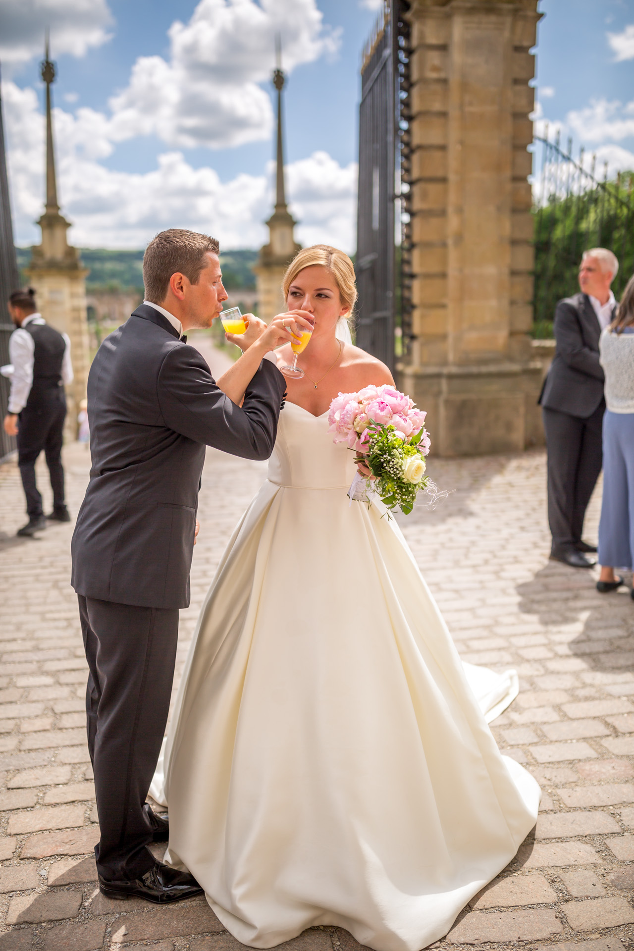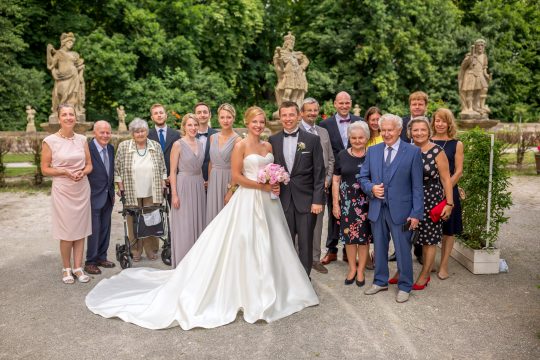 Vor der Kulisse des Schlosses bietet die Terrasse eine schöne Szenerie für den Sektempfang. Der Blick schweift über den Barockgarten auf der Südseite des Schlosses, der in der ersten Hälfte des 18. Jahrhunderts angelegt wurde.