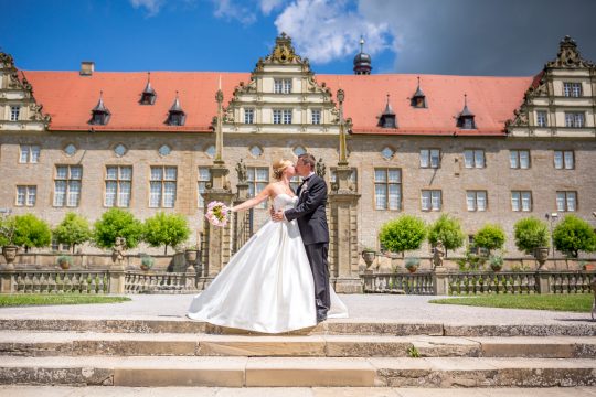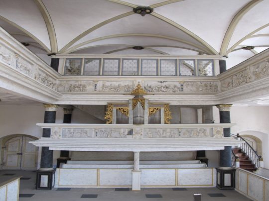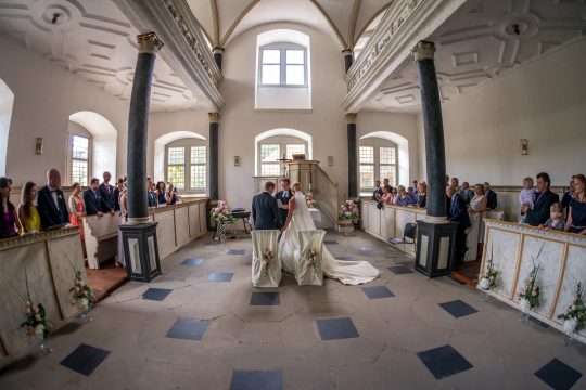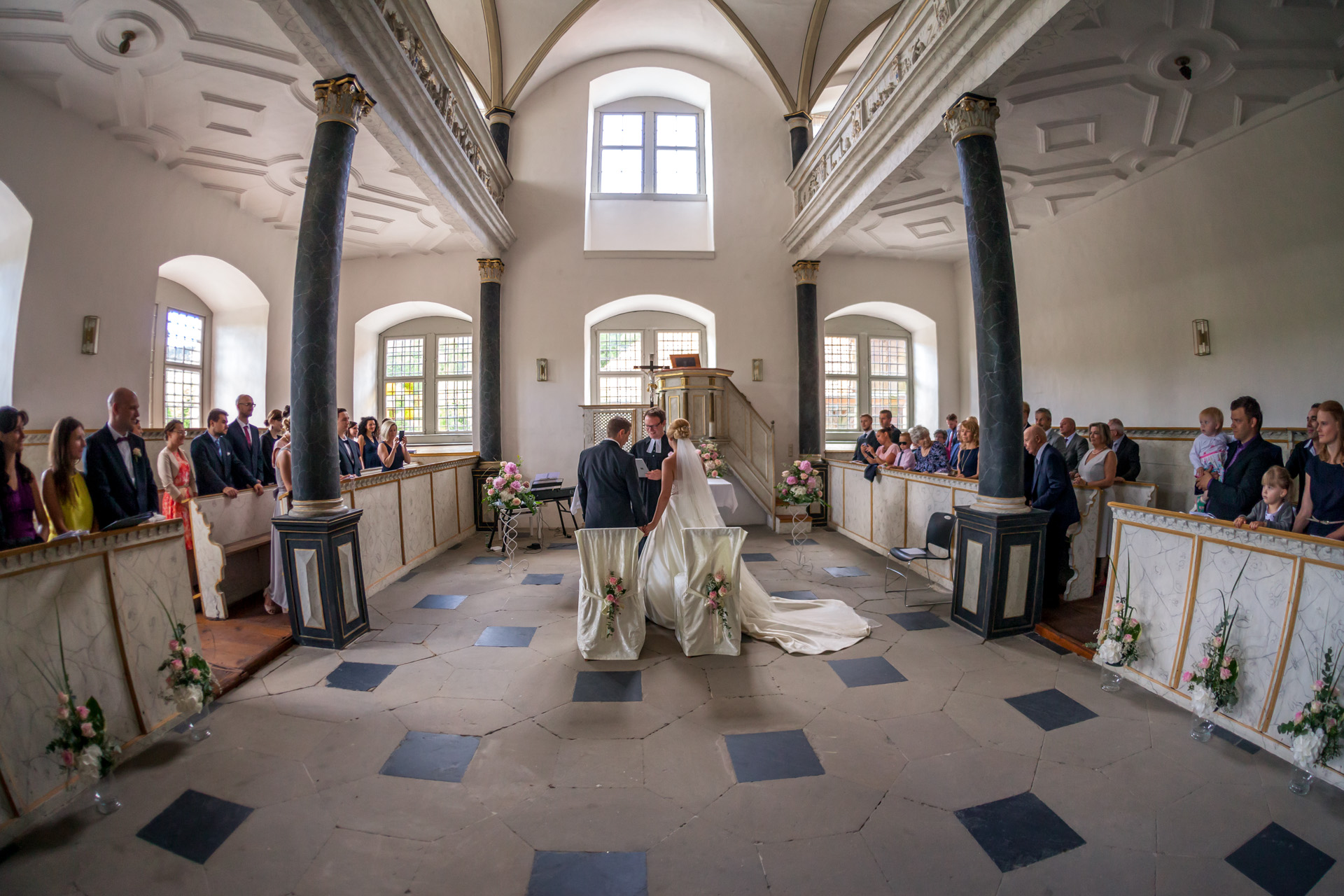 Die Schlosskapelle von Weikersheim wurde 1600 vollendet. Schwarze Säulen tragen die Empore, der Rest ist in Weiß und Gold gehalten. Hier werden wir getraut.