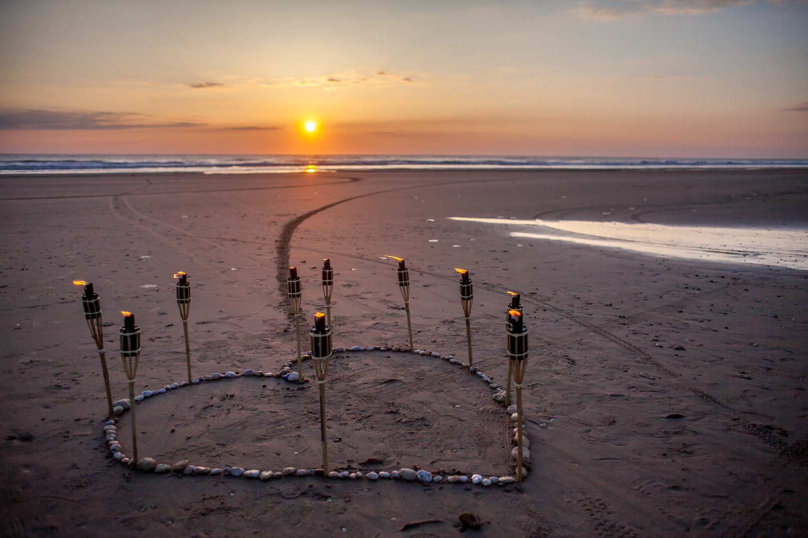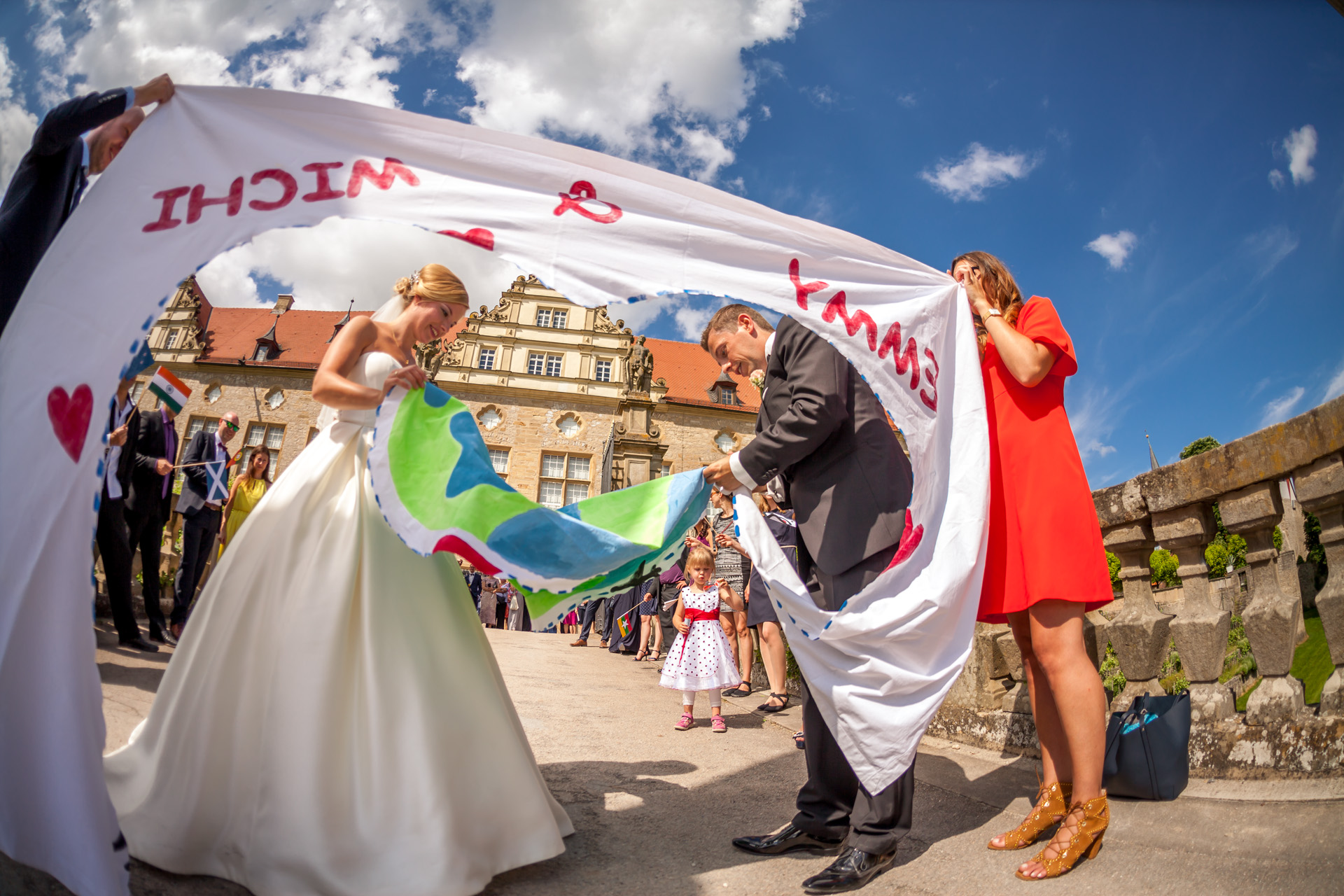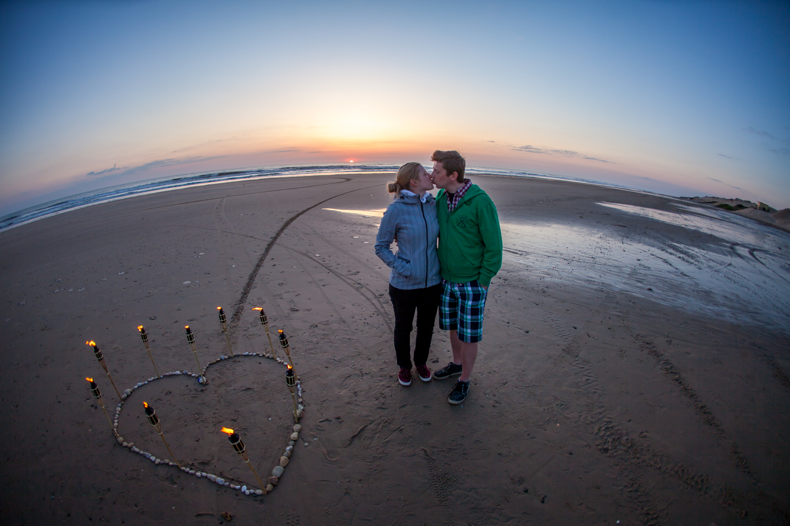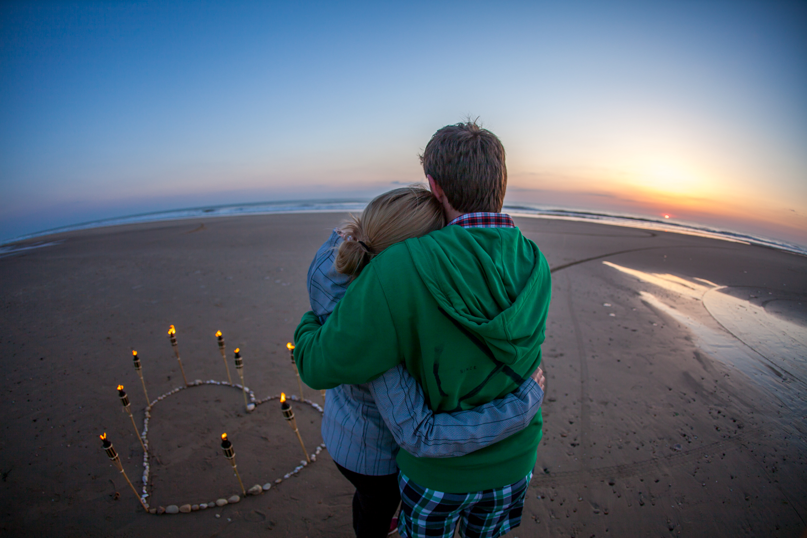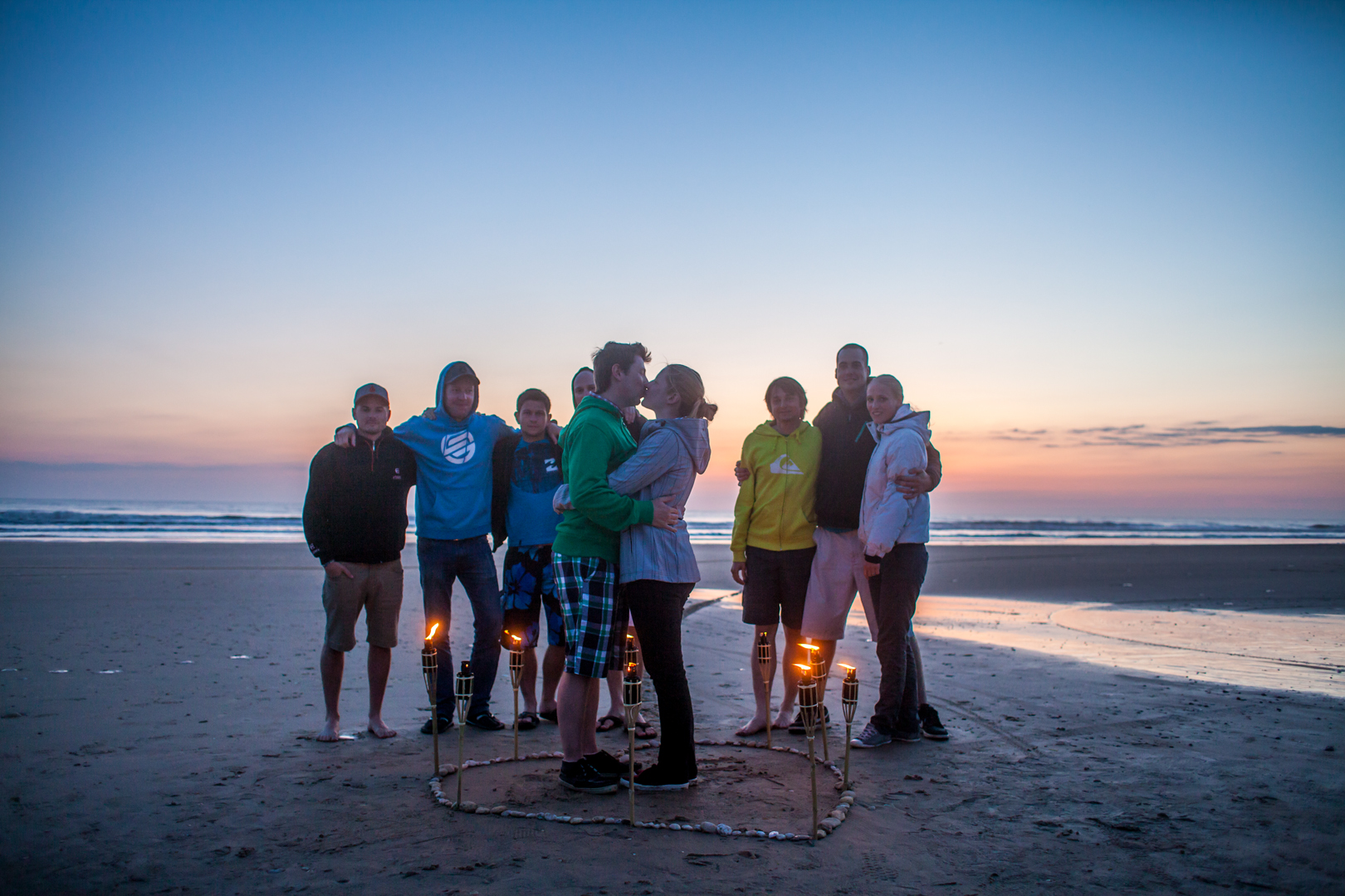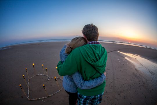 Der Heiratsantrag kam am 02.06.2013 während eines Urlaubs im Südwesten Frankreichs, in Montalivet-les-Bains. Damit Elise nichts merkte, bereitete Michael Mithilfe von Freunden am Strand ein Herz aus Fackeln vor. Zum Sonnenuntergang unternahmen dann beide einen Spaziergang, der direkt zum Fackelherzen führte. Der Antrag kam für Elise so überraschend, das sie gar nicht verstand, dass das alles für sie bestimmt war und nach ein paar Erinnerungsfotos den Spaziergang fortsetzen wollte. Doch Michael fing sie wieder ein und stellte die eine Frage. Elises‘ Antwort führt uns alle nun am 02.06.2018 ins Schloss Weikersheim.